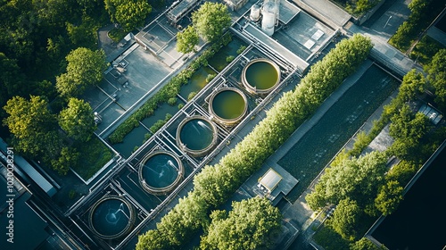 Aerial View of Industrial Water Treatment Plant with Surrounding Trees