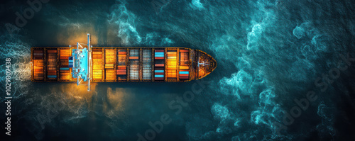 Aerial view of large container ship navigating through vibrant blue waters, showcasing colorful cargo containers and illuminated by ship lights, creating striking visual contrast