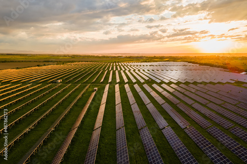 Aerial view of large sustainable electrical power plant with many rows of solar photovoltaic panels for producing clean electric energy at sunrise. Renewable electricity with zero emission concept
