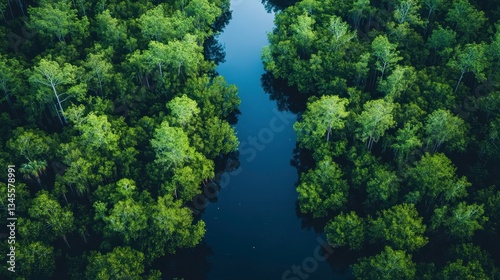 Aerial view of lush green forest and serene river nature landscape tranquil environment
