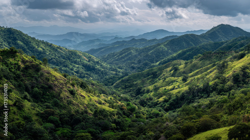 aerial view, mountain, vale, cloudy sky, tropical, remote, lush, green, landscape, nature, scenic, overlook, panorama, vista, horizon, hill, terrain, vegetation, tree, foliage, wilderness, environment, outdoors, daylight, daytime, weather, atmosphere, elevation, altitude, perspective, depth, gradient, shadow, sunlight, contrast, texture, pattern, surface, earth, geography, landform, ridge