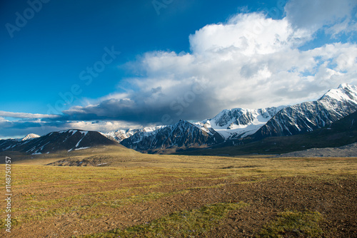 Aerial view of majestic altai mountains with snow and clouds, Altai Tavan Bogd, Mongolia