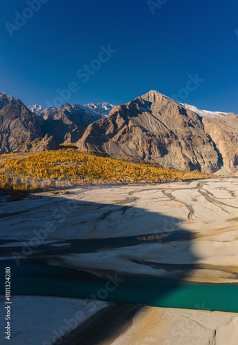 Aerial view of majestic mountains and a serene river in a tranquil valley with yellow trees, Sailing Valley, Ghanche District, Pakistan.