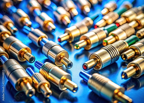Aerial View of Mini Jack Connectors on Vibrant Blue Background - Stock Photo
