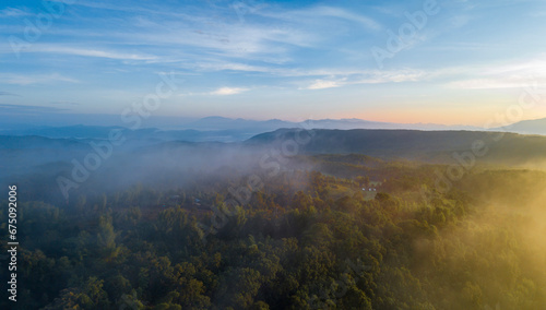 Aerial view of morning sunrise of tropical rainforest at dawn with misty and foggy cloud during summer for outdoor mountain valley landscape