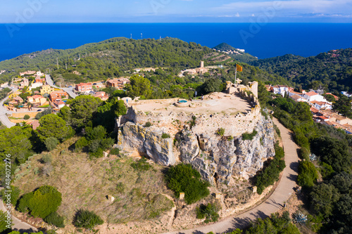 Aerial view of ruins of ancient fortified castle of Begur on hill dominating residential areas on sunny autumn day, Spain