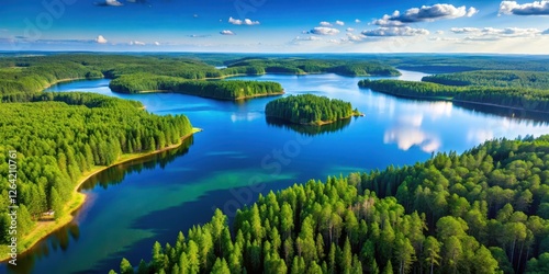 Aerial view of serene blue lakes surrounded by lush green forests on a warm sunny summer day in Finland from above