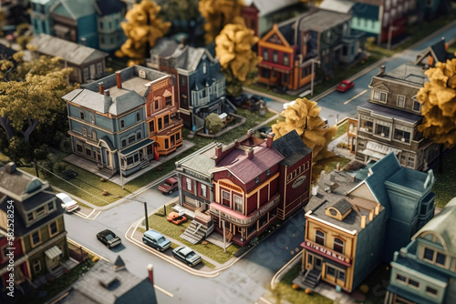 Aerial view of small town and colourful streets in 3D anime style. Digitally generated AI image