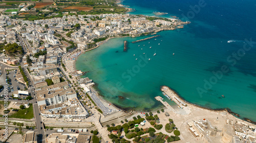 Aerial view of the beach of the city of Otranto in the province of Lecce, Salento, Puglia. There are many boats and yachts anchored in the bay with the blue and clean sea.