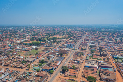 up high, aerial, architecture, building, city landscape, commercial, community, daytime, drone, horizon, infrastructure, landscape, light blue, neighbourhood, panorama, residential, road, scene, settlement, sky, street, town, transportation, tree, uganda, urban, vegetation, vehicle, view