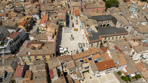 Aerial view of the historic center of Venosa, a small village in province of Potenza, Basilicata, Italy. A historic Italian town square with terracotta rooftops. It is a sunny summer morning.