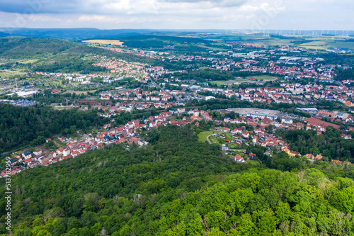 Aerial view of the skyline or citysccape of Eisenach with vast forest and green surrondings, Eisenach, Germany