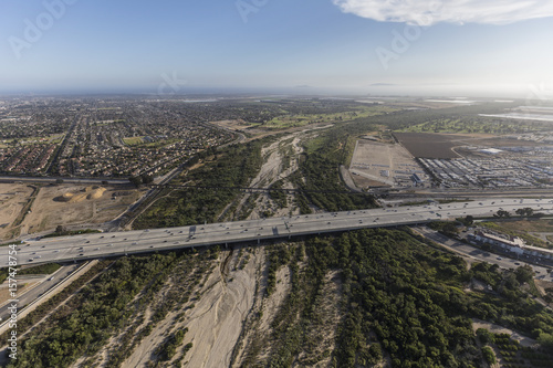 Aerial view of the Ventura 101 Freeway crossing the Santa Clara River in Oxnard, California.