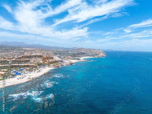 Aerial view of tropical beach with resorts in Cabo San Jose, Baja California Sur, Mexico