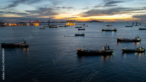 Aerial view oil tanker ship and gas tanker ship at sunset, Silhouette oil and gas tanker ship at oil and gas terminal, Global business import export logistic transportation oil and gas petroleum.