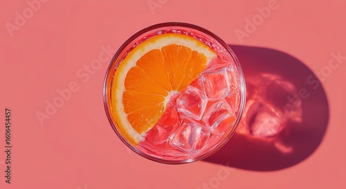 Aerial View Pink Drink with Ice Cubes and Orange Slice on Minimalist Pink Background for Beverage Promotion