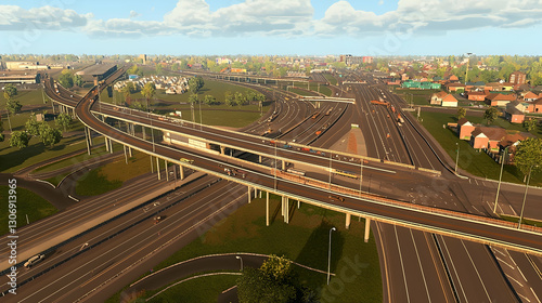 highway, interchange, traffic, city landscape, aerial, suburban, flow, road, transportation, infrastructure, vehicle, car, overpass, bridge, road, street, urban, landscape, commute, travel, driving, network, connection, logistic, system, engineering, construction, development, planning, design, movement, perspective, sky, cloud, sun, asphalt, concrete, structure, modern, route, pathway, journey, direction, speed, motion