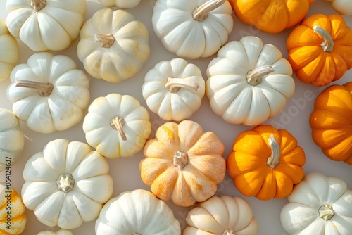 Aesthetic Display of White and Orange Mini Pumpkins