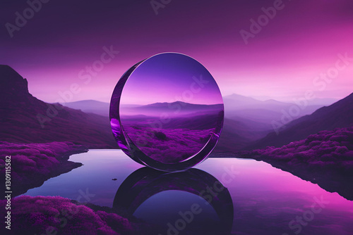 Aesthetic Harmony: A captivating, abstract scene unfolds, showcasing a pristine glass orb reflecting the serene hues of a purple landscape. Evoking tranquility and a sense of wonder.
