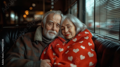 Affectionate elderly couple embracing under a red heart-patterned blanket, sharing a peaceful moment in a cozy café with warm tones and soft ambient lighting