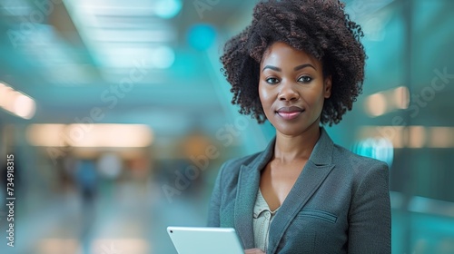 African American businesswoman diversity looking camera and tablet standing in co-working space modern workplace, executive business female happy remote working, confident young Insurance sales agent