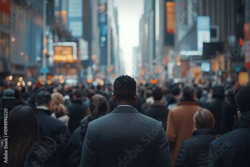 city landscape, city street, skyscraper, business district, crowd, people, pedestrian, rush hour, commuting, anonymous, backview, suit, businessman, professional, man, male, dark-haired, african american, city life, metropolitan, blurred background, depth of field, urban setting, modern architecture, new york city, city landscape, street scene, big city
