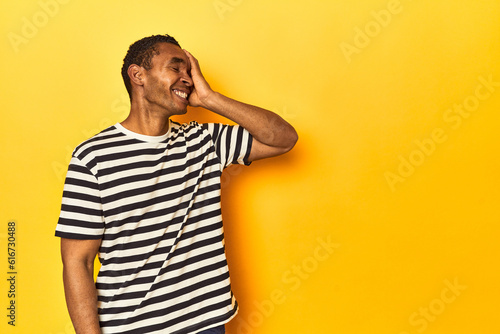 African American man in striped t-shirt, yellow studio, laughing happy, carefree, natural emotion.