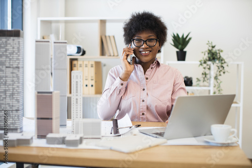 African businesswoman in 30s talks on smartphone about modern city project. She sits with laptop and architectural models in bright office, exuding confidence and professionalism.