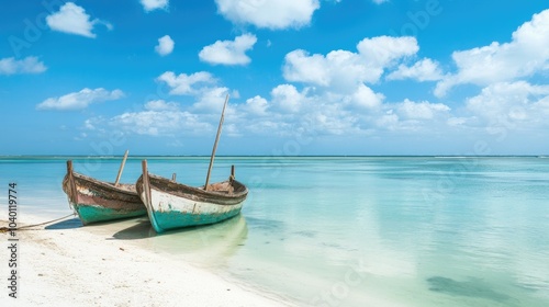 African fishing boats on a calm shoreline with space for text in the sky
