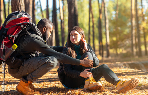 african american, black, man, helping, woman, accident, injured, painful, joint, muscle, foot, couple, friends, walking, adventure, tour tourism, forest, holiday maker, hike, mountain, hill, backpack, travel, trek, hand, assurance, healthy, guy, copy space, bandage, trail, mountain, bruised, pain, empty space, adult, active, activity, male, people, caucasian, help, support, friendship, team, teamwork, girl, love
