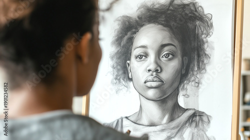 Afro-American teenage girl draws self-portrait in a quiet room during afternoon