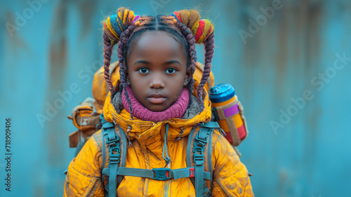 Afroamerikanisches Schulkind mit Anorak und Schultasche auf dem Schulweg