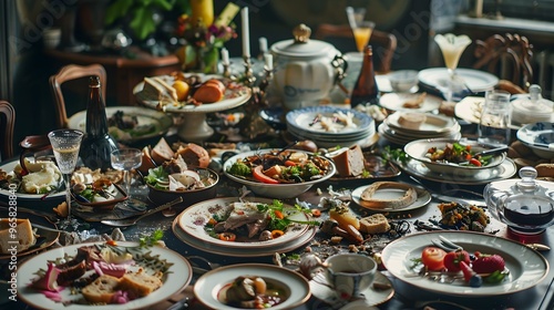 Aftermath of a Lavish Banquet Feast with Piled Dirty Dishes Capturing the Remnants of a Grand