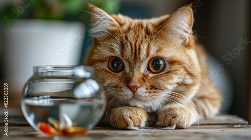 Against a serene white backdrop, a round, fluffy cat with big, expressive eyes contemplates a fishbowl with a comically exaggerated hungry expression.