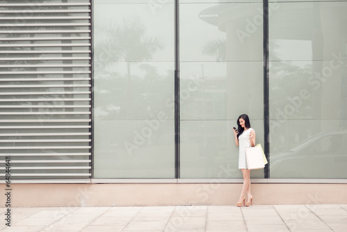 asian, vietnamese, woman, female, lady, girl, young, brunette, beautiful, attractive, holding, smiling, phone, mobile phone, mobile, technology, smart, elegant, standing, shopping, bag, paper, purchase, copy space, copy space, joy, lifestyle, beauty, pleasure, cute, leisure, alone, feminine, message, texting, full, dress, wall, modern, fashion, heel, waiting, reading, using, reflections, outside, outdoors, glasses, text message, communicate