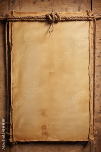Aged parchment tied with rough rope, rectangular shape, background, note, frame