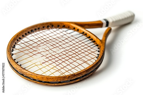 Aged Wooden Tennis Racket with Strings and Wrapped Handle Isolated on White
