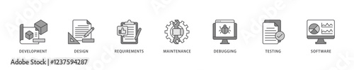 Agile icon set flow process which consists of development, design, requirements, maintenance, debugging, testing and software icon live stroke and easy to edit .