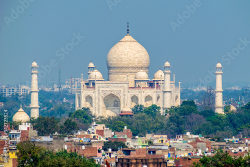 Agra, Uttar Pradesh, India- Feb, 2020 : a birds eye view of the Taj Mahal and the city of Agra, Agra, Uttar Pradesh, India