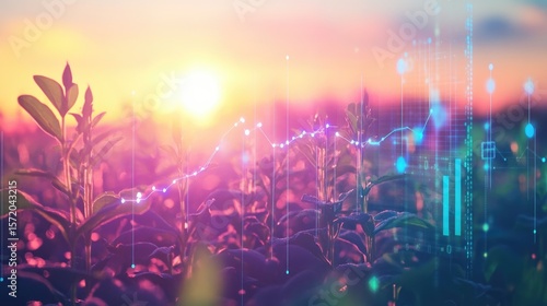 agriculture, technology, growth, innovation, farming, sunset, plant, field, datum, digital, future, progress, harvest, crop, dirtied, nature, sunrise, rural, landscape, evening, sky, horizon, plant, leaf, green, pink, purple, orange, yellow, light, colours, image, graph, chart, diagram, statistic, analysis, modern