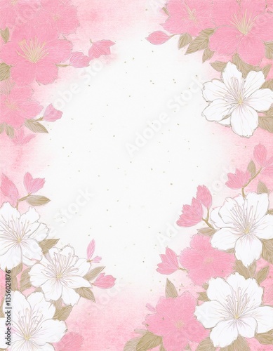 和紙に手書き描かれた白色とピンク色のつつじの花のフレーム背景素材。テキストスペースあり。AIで生成