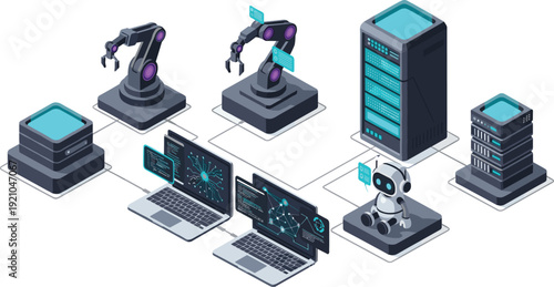 AI Automation and Robotics Isometric Illustration with Server Data Center, Machine Learning, Cloud Computing and Smart Technology Network