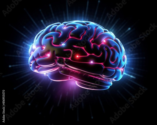 AI brain receiving human input, conceptual digital art, showcasing interaction and mutual growth, deep space black background with neon highlights