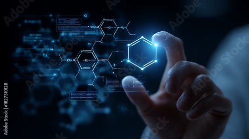 AI drug discovery interface hologram, molecular diagrams, futuristic pharmaceutical research, glowing blue tech