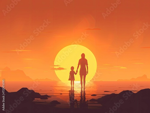 AI generated illustration of a silhouetted mother with her child on the beach at sunset