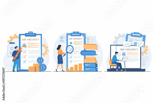 AI generated job vacancy and recruitment process illustration set with candidates resume review checklist analysis salary growth and online application management in modern business workflow