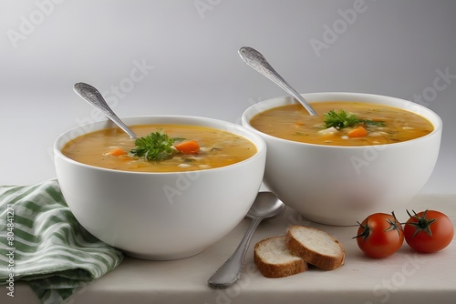 AI Generated-Two bowls of soup with spoons and bread on a table