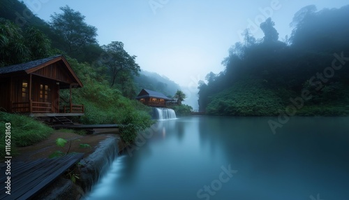 AI generator image of Country Resort style wooden house on the top of a mountain with a view of waterfalls and rocks, beautiful landscape