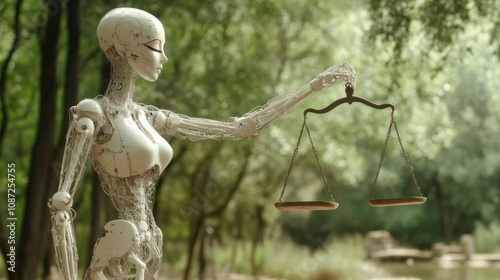AI robot carrying scales represents justice. 3d rendering robotic lady of justice hand hold law scale