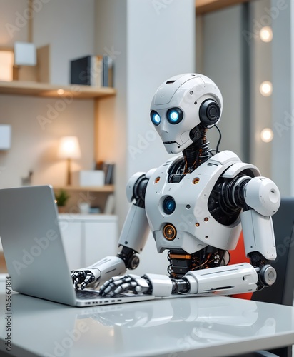 AI Robot Working on Laptop in Office